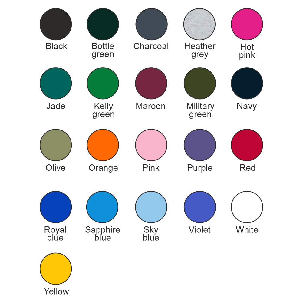 Colours: Black, Orange, Pink, Purple, Red, White, Yellow, Bottle Green, Charcoal, Heather Grey, Hot Pink, Jade, Kelly Green, Maroon, Military Green, Navy, Olive, Royal, Sapphire Blue, Sky, Violet