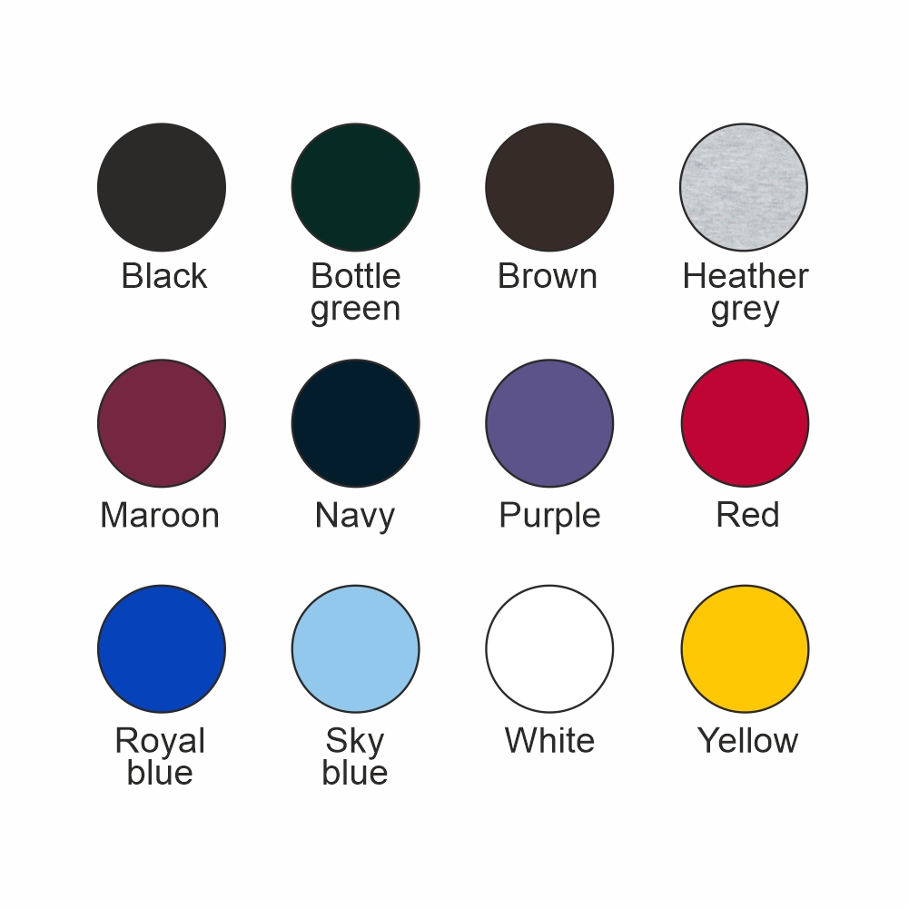 Colours: Black, Brown, Purple, Red, White, Yellow, Bottle Green, Heather Grey, Maroon, Navy, Royal, Sky
