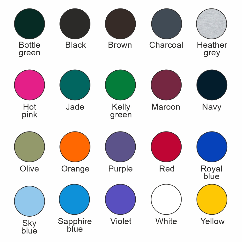 Colours: Black, Brown, Orange, Pink, Purple, Red, White, Yellow, Bottle Green, Charcoal, Heather Grey, Hot Pink, Jade, Kelly Green, Maroon, Military Green, Navy, Olive, Royal, Sapphire Blue, Sky, Violet