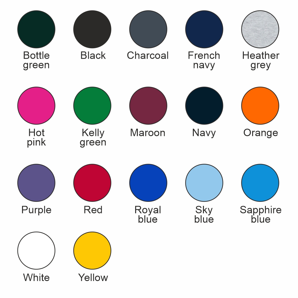 Colours: Black, Orange, Purple, Red, White, Yellow, Bottle Green, Charcoal, French Navy, Heather Grey, Hot Pink, Kelly Green, Maroon, Navy, Royal, Sapphire, Sky