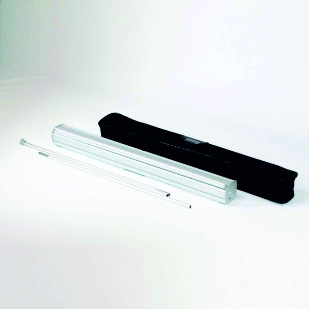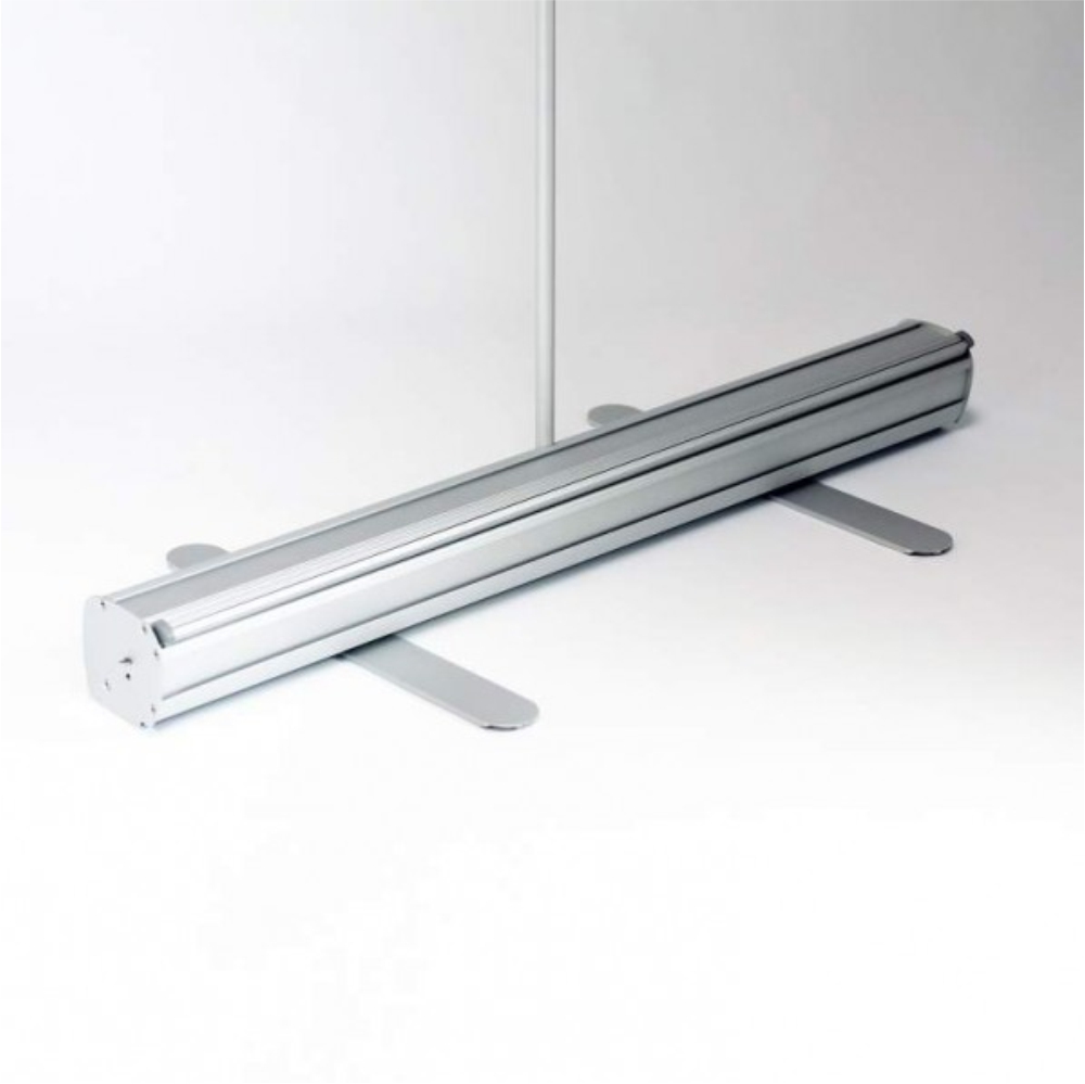 850mm wide entry level roller banner stand with fixed height pole, and two twist out stabiliser feet. Fitted with 600gsm block out full colour PVC graphic and supplied with carry bag.