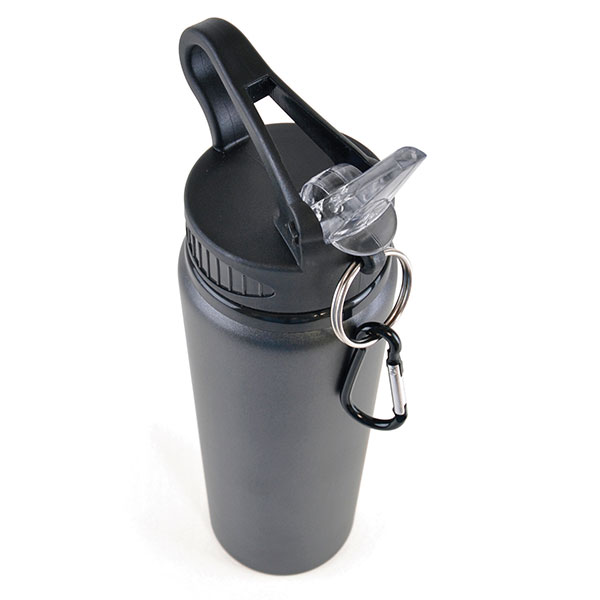 Fashion sports bottle Capacity: 800ml Single walled aluminium construction Integral sipping straw cap Black carabiner clip